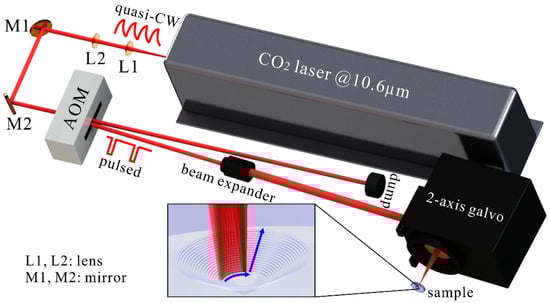 Figure 3 illustrates the experimental setup for surface modification by pulsed laser ablation. A CO2 laser (Synrad, Mukilteo, WA, USA) operating at 10.6 µm was employed to polish the surfaces of the multi-stage structure on a fused silica substrate because of the high absorption at this wavelength. The quasi-continuous wave emitted from the laser was chopped into approximately square pulses with a repetition frequency below 2 kHz and a duration in the microsecond regime, which was accomplished by an acousto-optic modulator (Isomet, Manassas, VA, USA). After traveling through a pair of collimated lenses and a beam expander, the beam was focused into a small spot (120 µm@1/e2) using a ZnSe f-θ lens with a 75 mm focal length. A sample was mounted on a motorized linear stage to precisely position the surface of interest at the focal plane. The position of the focal spot in the focal plane was controlled by a two-axis galvo (Scanlab, Puchheim/Munich, Germany, intelliSCAN) to complete the pre-designed motion patterns. In the case of polishing a quasi-conical multi-stage structure, the focal spot was moved along a series of concentric circles until the whole morphological modification process finished, as indicated in the insert in Figure 3.