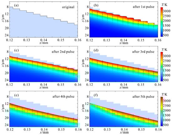A typical structural evolution and temperature profile during the smoothing process is displayed in Figure 4. The laser spot with a diameter of 120 µm was moved from the position of x = 0.1 mm to x = 0.18 mm with a velocity of 20 mm/s. Considering a complete polish cycle, the zone exhibited in the figure is an area irradiated by all five pulses. Shapes in light purple in these figures are the original multi-stage structures. The boundaries of the color maps are surface profiles at different time frames during the process. Compared with the original structure, it is clear that stairs are in gradual recession under the irradiation of successive laser pulses. Furthermore, for every cycle of irradiation, the sharp edges are always subjected to ablation first, then the subjected area became wavelike, as shown in Figure 4b. Owing to the non-uniform heating inherent to the laser-pulse ablation, the spatial distribution of the laser intensity results in the variation in surface temperature, leading to the spatial non-uniformity in ablation depth. It was not until the end of all of the five laser pulses that the stepwise structure turned into the expected continuous slope without waviness, as shown in Figure 4f.
