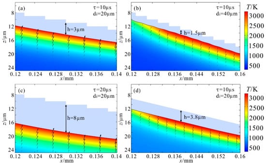 Typical morphological modification. (a) τ = 10 µs, di = 20 µm; (b) τ = 10 µs, di = 40 µm; (c) τ = 20 µs, di = 20 µm; (d) τ = 10 µs, di = 20 µm. The area in light purple is the original profile. The color maps present the temperature profiles at the end of a pulse.