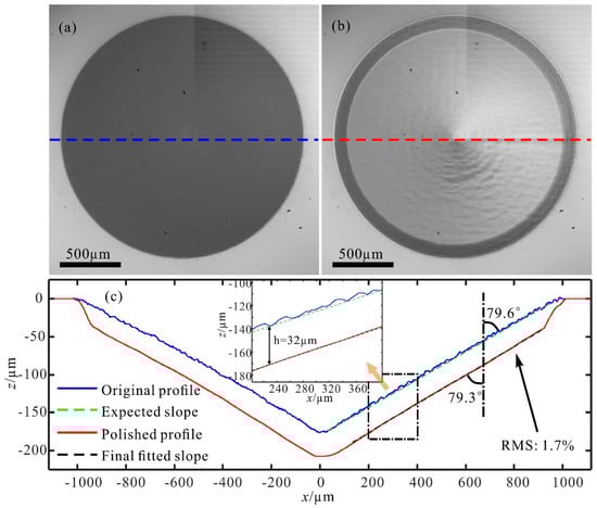 Optical microscope images of (a) the original multi-stage structure and (b) the structure after laser ablation. (c) Cross-section views of the multi-stage structure before and after polishing. The insert is an enlarged view of the area in the rectangle. Profiles are characterized by a stylus profiler with a vertical (z-direction) resolution of 8 nm and a transversal (x-direction) resolution of 0.1 µm. Slopes (dashed lines) were fitted according to the profiles.