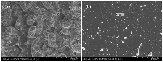 Additionally, Figure 7 displays the SEM images of the slope area of a typical original multi-stage structure and its counterpart after laser ablation. Disorderly particles and gullies of various dimensions in the original rugged surface disappear after the ablation, and its microstructure evolves to become more uniform and with fewer and finer particles. This suggests the excellent quality of the processed surface.