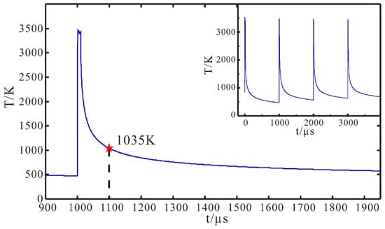 Axial-temperature beyond a laser pulse. The red star indicates the temperature of 1035 K at 100 µs after the start of a laser pulse. The insert displays the typical variation of the axial-temperature during the pulsed laser-ablation process.