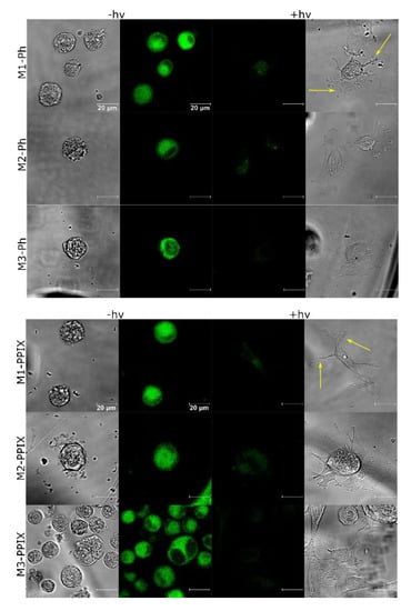 - Przybyło, M.; Głogocka, D.; Dobrucki, J.; Frączkowska, K.; Podbielska, H.; Kopaczyńska, M.; Borowik, T.P.; Langner, M. The cellular internalization of liposome encapsulated protoporphyrin IX by HeLa cells. Eur. J. Pharm. Sci. 2016, 85, 39–46. [Google Scholar] [CrossRef]