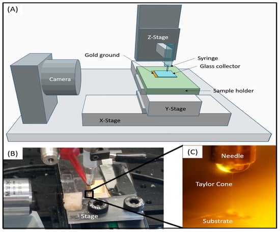 (A) A schematic depiction of the complete electrospinning printer setup. (B) The direct-write printhead and collector stage. (C) Detail image showing single fiber erupting from Taylor cone on surface of the droplet meniscus and depositing on substrate collector.