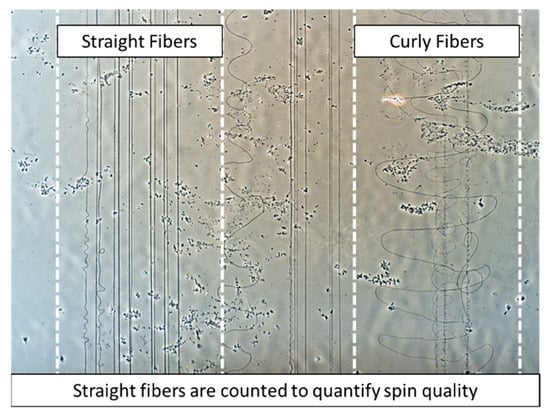 The quality of fibers produced can vary drastically given the combination of chamber humidity, spin voltage, and acetic acid concentration. For this reason, a quantitative measure of spin quality was defined after preliminary investigations of direct-write electrospinning parameters. During each electrospinning experiment, a target number of straight collagen fibers was recorded along with the resultant number of straight fibers produced. Primarily, our use of direct-write electrospinning is as an additive manufacturing technique capable of producing highly organized electrospun scaffolds. As such, production of wavy or curly fibers reduce placement accuracy and predictability of the print technique, and hence, these fibers were excluded from the line counts (Figure 2). Here, we define the spin quality ratio (SQR) as Equation (1):