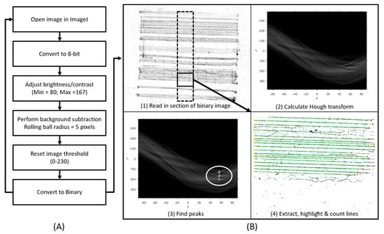 In Matlab, a Hough Transform routine was used to approximate the number of organized horizontal fibers in the image. A 1000 × 1000-pixel subsection was first extracted along the centerline of the parent image and the Hough transform was calculated for that sub-image. Peaks were found within the transform image and used to identify horizontal lines within a given angular threshold. The entire sequence was repeated for the entire parent image. The algorithm was refined and validated via manual counts across several sample images.