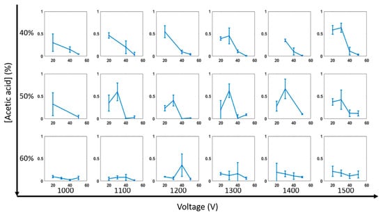 For 40% acetic acid, as the voltage increases there is a slight increase in SQR, particularly at a relative humidity of 30%, while no apparent trends seem to be present for 50 and 60% concentrations. Microscopic inspection of samples (not shown) showed an increased presence of electrospun material at higher humidity. As the RH increases, the fiber production rate also increases, resulting in fibers piling up in an organized fashion as they exceed the XY motor translation speed.