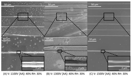 While light microscopy readily identifies fiber linearity, SEM images were recorded in order to closely examine fiber morphology as the voltage and relative humidity was manipulated. Figure 6 illustrates the morphology for collagen fibers produced with 40% acetic acid solution and 30% RH over voltages covering the entire investigated range. Fibers were solid with cylindrical morphology and high aspect ratio across the range of attempted voltages. Collagen fiber diameter remained consistent, measuring ~1–2 microns across the voltage range. Small cracks and surface defects seen on images can be attributed to defects in the carbon coating used for SEM inspection. These fibers exhibited both good morphology and high SQR, demonstrating highly organized fiber placement.