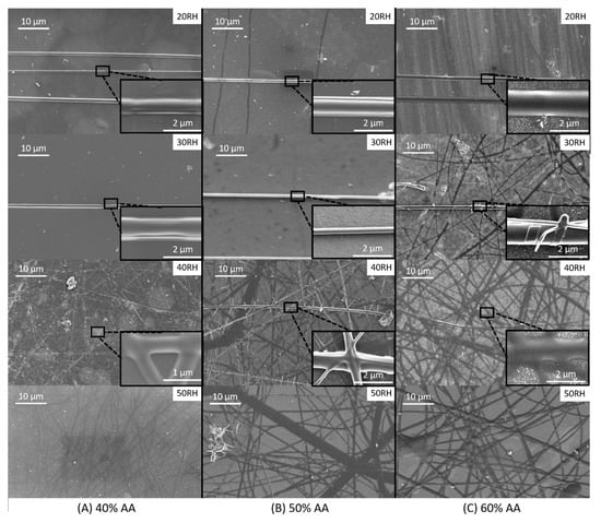 SEM images of fibers electrospun at 1500 V for various relative humidity (shown in upper right of each image) and acetic acid concentrations of (A) 40%, (B) 50%, and (C) 60%.