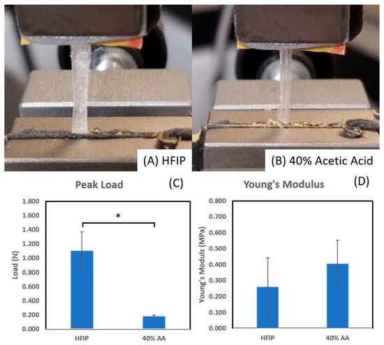 As a proof of concept, thick collagen nanofiber mats were electrospun at 30% relative humidity from 40% acetic acid (250 mg/mL collagen) and HFIP solutions (138 mg/mL collagen) to form 30 layers of fibers. These nanofiber mats were mechanically tested to measure ultimate tensile strength and Young’s modulus. Fiber mats were electrospun to a thickness of 30 layers. Figure 8A,B show the resultant fiber mat loaded into the tensile testing setup at the beginning of an experiment. It is apparent from the image that fiber mats spun from HFIP solution are thicker than mats from acetic acid solution. This is consistent with previous work showing electrospun collagen from HFIP solutions having larger fiber diameters than acetic acid solutions [23,24,25]. Figure 8C,D compare the average peak load and young’s modulus with standard deviation. Although the peak load for HFIP-based fiber mats is significantly higher (p = 0.006) than AA-based fiber mats, the young’s modulus show no statistically significant difference (p = 0.268). Future work and studies will look at further categorizing the influence of crosslinking, layer amount, and spinning solvent on material properties.