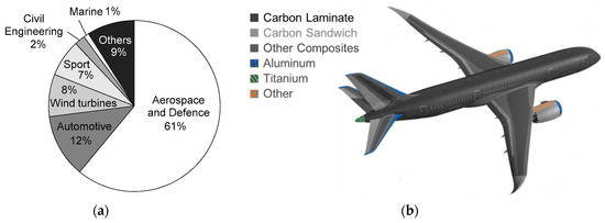 Use of composites: (a) Carbon Composite material market (redrawn from [8]); (b) Materials used in a Boeing 787 (redrawn from [9])