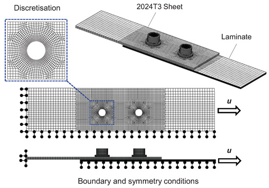 There are different methods and levels for laminate modeling, due to a complex laminate structure and different aims of analysis [25,26,27]. Despite a continuous increase in the computing power and performance (calculation ability) of numerical algorithms, the modeling of mechanically fastened joints (riveted, bolded, etc.) of CFRP laminate is still a challenging task. On the one hand, this difficulty is caused by a complex laminate structure (different stiffness of components, various modes of laminate failure, as well as notch and point load sensitivity of laminates [1,28,29]). On the other hand, it results from the nonlinearity of the contact problem and size of the connected parts of the structure.