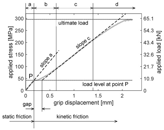 Four ranges a-b-c-d can be identified on the graph. In the first proportional/linear range (marked with the letter a), the load between parts of the joint is transferred mainly by static friction. In point P, friction becomes kinetic and stiffness rapidly decreases. An imperfection range (marked with the letter b) is characterized by a gradual stiffness increase. In this range a joint is straightened, clearance is taken up and other imperfection are levelled (e.g., lack of symmetry, lack of holes concentricity). In the main range (marked with the letter c), the curve is almost linear as at the beginning. The load in the connected parts is transferred by both bearing and by-pass stresses.