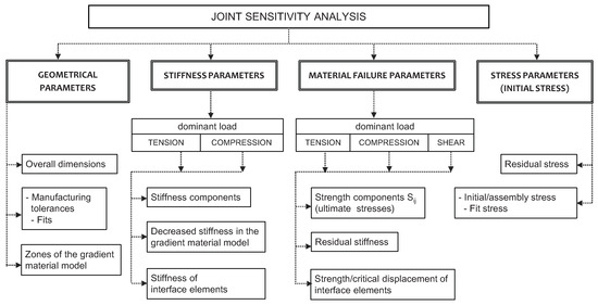 In the group of stress parameters, residual and initial stresses were considered. These stresses occur at the manufacturing and assembly stages, including sheet rolling, laminate curing, hole drilling and elements connecting. Manufacturing/assembly stresses can be divided into intentional (desired) and unintentional (undesired). The stresses caused by bolt-torque (and thus washer/nut pressure) belong to the first group. Undesired effects are the result of technological imperfections such as clearances (interferences), lack of joint symmetry, lack of holes concentricity and uneven bearing stress distribution.