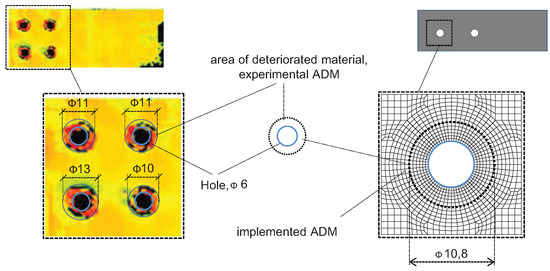 It was identified using the NDT ultrasonic method that the drilling process caused deterioration/changes in the material around the hole. The shape of the area of the deteriorated material (ADM) is irregular; however, it can be approximated using a ring shape with the inner diameter coincident with the hole diameter (Figure 9). Such approximation is more suitable for numerical implementation. The average outer diameter of those areas in the analyzed laminate coupons is equal to about 11 mm. The exemplary results of the NDT tests and corresponding ADM in the finite element model are presented in ref. [53].