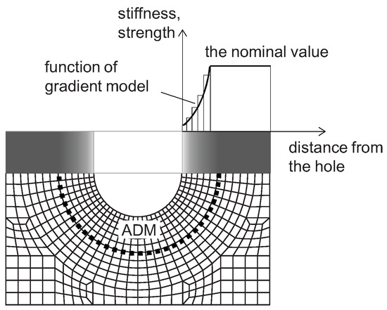 In refs. [53,62], it was found that the initial delamination only (without any changes of intralaminar properties) did not sufficiently affect the numerical results. This leads to the conclusion that the drilling process caused significant changes of laminae in the hole vicinity, i.e., changes in material properties. In order to describe the laminate deterioration, a gradient material model is proposed in ref. [53]. The function of gradient material properties is unknown and cannot be determined experimentally, therefore, sample functions were proposed to estimate it. The concept of a material gradient model is presented in Figure 10.