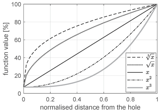 Five sample functions were analyzed: cube root, square root, linear, quadratic and cubic function (Figure 11). The sample function describes a stiffness/strength ratio of a current to a nominal value versus the normalized radial distance from the edge of the hole. The normalizing factor is equal to the width of the ADM ring. The minimum value of stiffness/strength at the edge of the hole was established as 7% of its nominal value. This value is both close to zero and high enough to ensure convergence of the numerical calculations. The material parameter at the outer diameter of ADM and beyond this area is equal to its nominal value.
