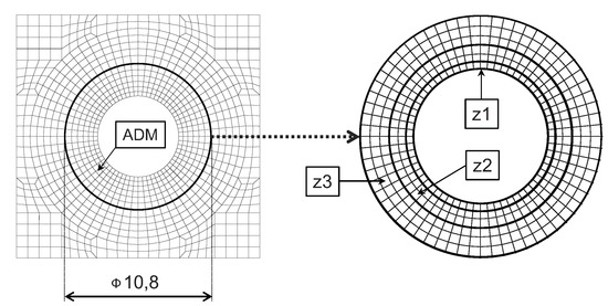 ADM was implemented in a discrete manner; i.e., the total area was divided into zones with different values of material properties. A value of a sample function corresponding to the middle of a selected zone (of gradient model) was assigned to the whole zone. Several cases of ADM division (in the hole vicinity) were tested [53], and it was found that three zones with a radially increased number of elements (shown in Figure 12) led to the most appropriate results [62], and therefore this case was adopted to further analyses.