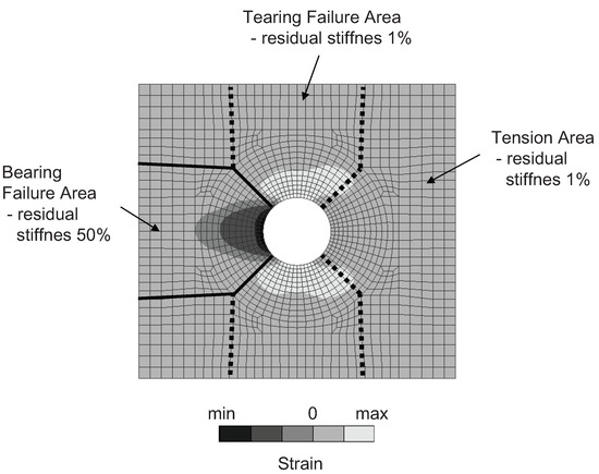 Whereas, in the bearing area, the stiffness of the failed/degraded material can be substantially greater than in the tension area, especially if the displacement of material in the transverse direction is constrained (Figure 7).
