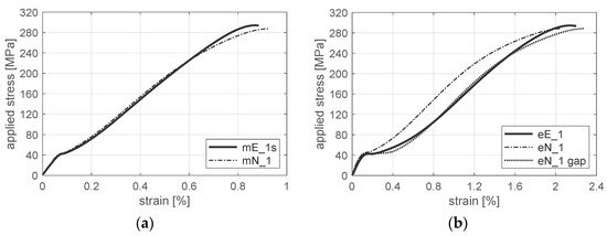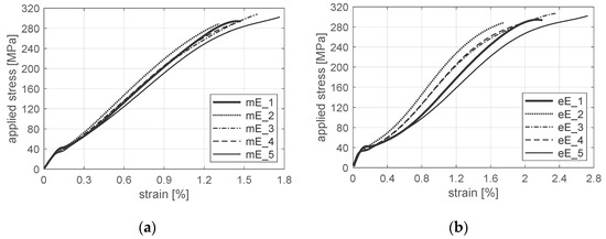 Characteristics of mechanically fastened joints based on: (a) displacement of testing machine grip; (b) length of extensometer gauge; where prefix m/e—grip displacement/extensometer length, E—experimental results, 1–5—specimen numbers.