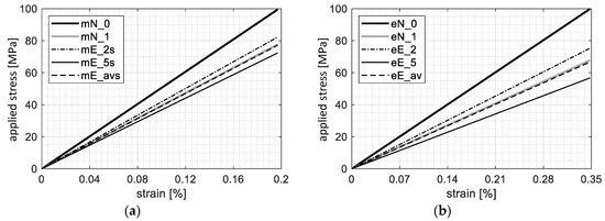 The residual stresses remained after the stage of curing the laminate are a result of different thermal expansion coefficients. This phenomenon concerns all laminates consisting of orthotropic plies aligned in different directions; however, it is especially visible for laminates co-curing with metal alloys (typically aluminum or titanium alloys in aircraft structures) [74,75,76]. This effect was not directly involved in the analyzed models; however, it can influence the stiffness and strength of a real laminate specimen. It was observed, during material identification tests, that the longitudinal stiffness of quasi-isotropic laminate is several percent lower than that calculated by means of Classical Laminated Theory (Figure 8).