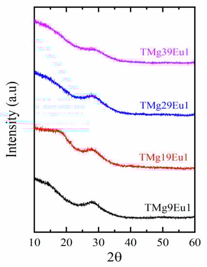 Since the 1 mol% of Eu2O3 doping is a high concentration, the risk of crystallization is a concern. The amorphous nature of the prepared Europium-doped magnesium tellurite glasses was confirmed by XRD measurement. The results are shown in Figure 1. No sharp crystalline peaks are observed, only the hump around 30° that is characteristic for glasses.