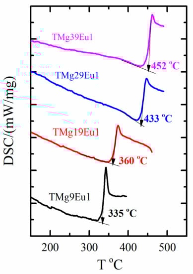 Here, an increase in the Tg can be observed when the MgO content is increased. However, when compared with the undoped glasses [], the Tg is found to be higher for the doped glasses than that of the undoped glasses reported in our previous work (see Table 1). This behavior is attributed to the higher bond enthalpy of Eu-O (557 KJ/mol) compared to that of Mg-O (358 KJ/mol) [,].