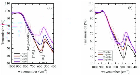 Attenuation of Total Reflectance (ATR) transmission spectra: (a) for the (TMgx) undoped series; (b) for the (TMgxEu1) doped series. The peak position of the TeO3 with the non-bridging oxygen (NBOs) line was fixed at 760 cm−1, the TeO3 at 700 cm−1, and TeO4 at 580 cm−1.