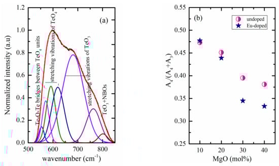 To have a better view of the structural changes, the spectra were converted to absorption. A baseline anchored at 525 and 850 cm−1 was subtracted and the spectra were normalized, and then deconvoluted using Gaussian shape components [,]. Figure 4a represents an example of the deconvoluted spectra. From the deconvoluted data, the change in the area of the bands related to the TeO4 (assigned as A4) and TeO3 (assigned as A3) and the ratio between areas of bands related to the TeO4 structural units to the total area was calculated and is plotted in Figure 4b. This ratio can be considered in a first approximation to be proportional to the concentration of the species and confirms the conversion of TeO4 to TeO3 units. The difference between undoped and doped glasses becomes greater the higher the MgO content (x = 29 and 39 mol%).