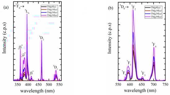 The emission and excitation spectra for Eu3+ are presented in Figure 5. The excitation spectrum (Figure 5a) shows six lines, all originating from the ground state 7F0 to different excited states centred around 363, 380, 394, 416, 466, and 530 nm corresponding to the energy states 5D4, 5G4, 5L6, 5D2, and 5F1, respectively [,,,]. In all of the prepared glasses, the excitation spectra were identical, as expected since the f–f transitions were shielded. The maximum excitation at 392 nm, corresponding to the transition 7F0→5L6, was chosen to discern the emission spectra of Eu3+ ions presented in Figure 5b.