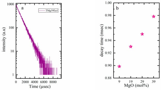 Figure 7a shows an example of the decay curves. The decay is found to have a single exponential and this behaviour suggests that the Eu3+ is homogeneously distributed in the glass host. The decay times (τ) were obtained and used to calculate the decay rate (decay rate = 1/τ (ms−1)) (see Figure 7b).