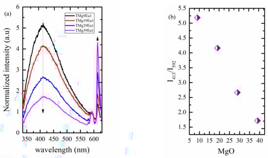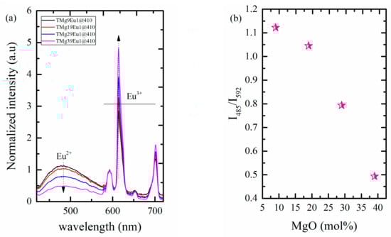 As excitation with 410 nm gives the highest intensity of Eu2+ emission and the emission falls in the white region. This wavelength was used to record the emission spectra for all of the glasses and here we can follow how the host will affect the emission under certain excitations (see Figure 12a). The spectra show that the Eu2+ emission’s relative intensity compared to the normalized Eu3+ emission decreases with increasing MgO content. No shift was observed for the position (≈485 nm). A similar trend is observed with an excitation at 330 nm in Figure 8a, but at a higher wavelength (≈485 nm) compared to that reported for Duran glasses (≈450 nm) []. The ratio between the intensity of Eu2+ emission to the pure magnetic transition of Eu3+ (I485/I592) indicates that the decrease in the intensity of the Eu2+ emission is associated with increase in the intensity of the hypersensitive transition of Eu3+ that could propose an energy transfer from Eu2+ to Eu3+ (see Figure 12b).