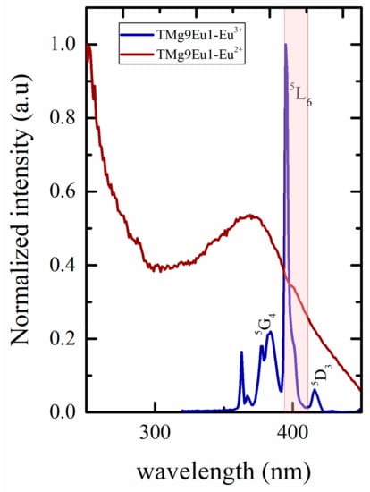 Figure 8b shows the ratio between Eu2+ and Eu3+ emissions at 413 nm and 592 nm, respectively. The emission at 592 nm was chosen because it is a pure magnetic transition that is not affected by any structural change around the RE ions. It can be used as a reference and its intensity is proportional to the Eu3+ concentration. This ratio decreases with increasing MgO content, which can be understood as being due to a change of the redox state of Eu or to a decrease of Eu2+ emission. It is known that the intensity and the position of Eu2+ can be affected by the ligand field, doping concentration, and by the excitation wavelength; therefore, we first discuss how it would be affected by the change in the excitation wavelength. Figure 9 shows an example of how the Eu2+ emission changes under different excitation wavelengths for the glass sample TMg9Eu1. The emission of Eu2+ was recorded along with that of Eu3+ over the range 430–780 nm under different excitation wavelengths. A shift toward a lower energy could be observed upon increasing the excitation wavelength. The emission shifts from 455 nm to 483 nm between an excitation at 390 and 412 nm.