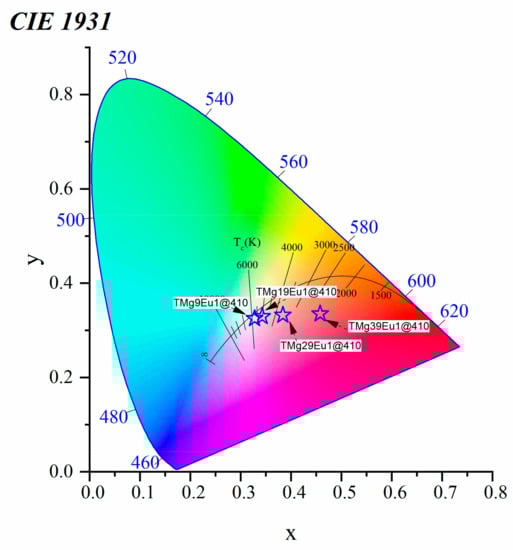 The evolution of the intensity ratio between Eu2+ and Eu3+ allows us to tune the emitted color of our glasses as previously seen but this time using glass chemistry. The colour coordinates were computed from the spectra of Figure 12a, and are reported in Figure 13. From the Commission International de I’Eclairage (CIE) diagram, it can be noticed that the TMg9Eu1 is almost in the cool white region with its x, y coordinates (0.32, 0.32). As MgO increases, the colour coordinates of the emission under an excitation at 410 nm shift away from the white to the red-orange region.