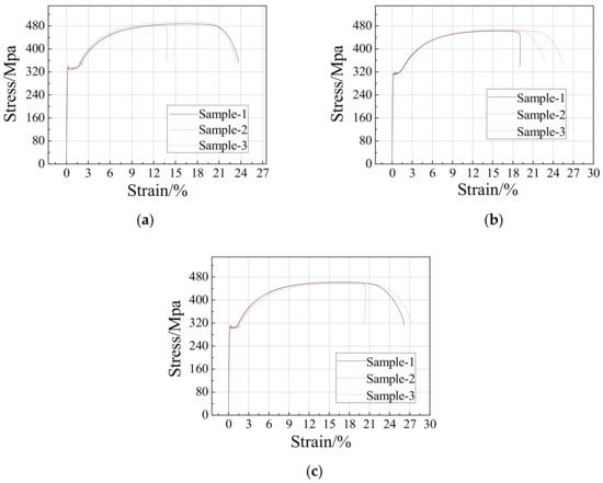 Material test of steel plate: (a) 3 mm thick steel plate; (b) 4 mm thick steel plate; (c) 5 mm thick steel plate.