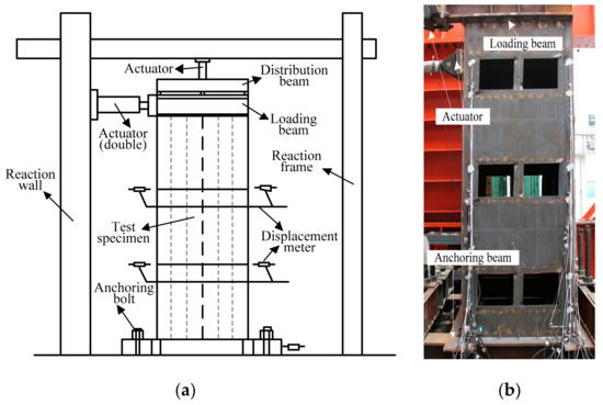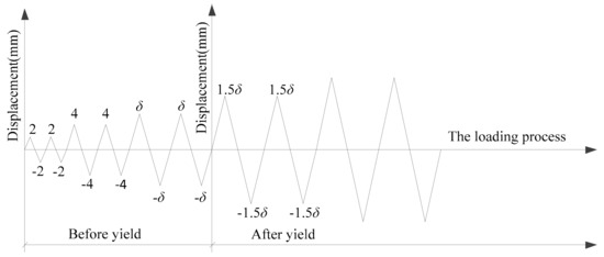 The vertical load was applied according to the axial compression ratio of 0.1, and then the horizontal load was applied with the vertical load unchanged. Two horizontal actuators were loaded synchronously. The displacement control method was adopted for reversed-cyclic loading. Each load level was cycled twice during the loading process. Before the yield of the specimens, the control displacement increment was 2 mm. After the specimens yielded, the 0.5 times of yield displacement was taken as an increment. The loading system is shown in Figure 5.