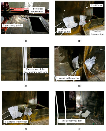 At the beginning of loading, the specimen-1 was in the elastic stage. When the two horizontal actuators were loaded synchronously to the horizontal displacement of 8 mm, it could be known from the monitoring data of the strain gauges that the steel plate at the four corners of the door opening yielded. When the two horizontal actuators were loaded synchronously until the horizontal displacement was 42 mm, the four corners of the upper story door opening were buckled and deformed, and the T-stiffener at the middle position on the upper story gable had torsional deformation, as shown in Figure 6a. At this time, the maximum value of lateral force resistant capacity (pull direction) of specimen-1 was about 510 kN. When the two horizontal actuators were loaded synchronously until the horizontal displacement was 48 mm, the four corners of the lower story door opening were buckled and deformed, and the T-stiffener at the middle position on the lower story gable had torsional deformation, as shown in Figure 6b. At this time, the maximum value of lateral force resistant capacity (push direction) of specimen-1 was about 560 kN. When the horizontal displacement increased to 54 mm, the corners of the door opening of specimen-1 was torn (Figure 6c), and cracks appeared in the four corners of the specimen-1 (Figure 6d). At this time, the lateral force resistant capacity of the specimen-1 in both pushing and pulling directions began to enter the softening phase. When the two horizontal actuators were loaded synchronously until the horizontal displacement was 72 mm, the T-stiffener at the lower story of the gable was completely broken (Figure 6e), and the four corners of the specimen were torn (Figure 6f). At this point, the lateral force resistant capacity in both directions (push and pull) had decreased to below 85% of the maximum value, and the test was finished.