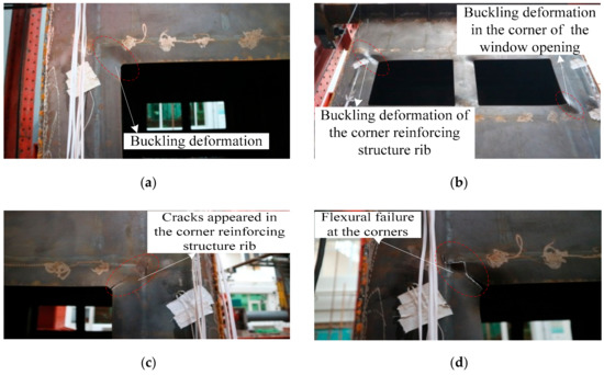 At the beginning of loading, the specimen-2 was in the elastic stage. When the two horizontal actuators were loaded synchronously to the horizontal displacement of 6 mm, it could be known from the monitoring data of the strain gauges that the steel plate at the four corners of the window opening yielded. When the horizontal displacement was 8 mm, the slope of the load versus displacement curve of the specimen-2 began to change, and the specimen-2 began to yield. When the horizontal displacement was 24 mm, the buckling deformation of the four corners of the window opening was obvious, as shown in Figure 7a. When the two horizontal actuators were loaded synchronously to the horizontal displacement of 48 mm, the cracks in the corner of the window opening of the specimen-2 developed further, and the buckling deformation of the corner reinforcing structure rib of the specimen-2 was obvious, as shown in Figure 7b. At this moment, the lateral force resistant capacity of the specimen-2 reached the maximum. When the horizontal displacement was 54 mm, cracks appeared in the corner reinforcing structure rib of the specimen-2, as shown in Figure 7c. At this time, the lateral force resistant capacity of the specimen-2 in both pushing and pulling directions began to enter the softening phase. When the two horizontal actuators were loaded synchronously to the horizontal displacement of 66 mm, the flexural failure of the specimen-2 at the four corners was observed, as shown in Figure 7d. At this point, the lateral force resistant capacity in both directions (push and pull) had decreased to below 85% of the maximum value, and the test was finished.