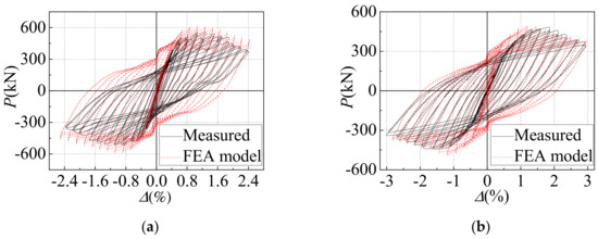 Comparisons between the measured and simulated inter-layer shear (P) versus inter-layer displacement angle (Δ) relations are shown in Figure 8. The hysteresis curves obtained by simulation were fuller than that measured by a test, and the loading stiffness and unloading stiffness were both higher. This was because the materials in the FEA model were uniform. It was impossible to accurately simulate the tearing failure of steel plate. However, in general, the pinching phenomenon was well captured, and the FEA models reached a reasonable agreement with the measured results for the two specimens. So, this finite element analysis method could be used to conduct a more in-depth analysis of the two specimens.