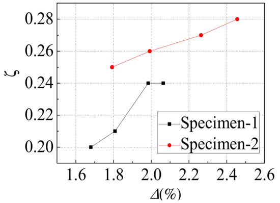 Figure 11 exhibits the equivalent viscous damping ratio (ζ) versus inter-layer displacement angle (Δ) curves for the middle story of the two specimens. The equivalent viscous damping ratios of the two specimens both showed an increasing tendency as the inter-layer displacement angle increased, and the equivalent viscous damping ratio of the specimen-2 was greater than that of specimen-1. This was because the window openings in the gable of specimen-2 weakened the strength and stiffness of the steel plate more than that of specimen-1, and made the anchoring effect of the corner reinforcing structure ribs of specimen-2 on the steel plate better than that of specimen-1. Compared with specimen-1, although the initial stiffness and the lateral force resistant capacity of specimen-2 were lower than that of specimen-1, specimen-2 had better energy dissipation capacity and deformation capacity.