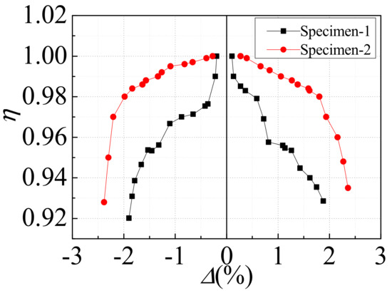 The strength degradation coefficient (η) is adopted to represent the strength degradation of the specimen, where the strength degradation coefficient (η) means the ratio of the peak point load of the last cycle to the peak point load of the first cycle under the same displacement amplitude. Figure 13 exhibits the strength degradation coefficient (η) versus the inter-layer displacement angle (Δ) curve of the two specimens. It could be seen from Figure 13 that during the whole loading process, the strength degradation of specimen-1 was more serious than that of specimen-2, which also verified that specimen-2 had better ductility. This was because the opening position of specimen-1 was asymmetric, and the bearing capacity of the two directions was different during cyclic loading. When the inter-layer displacement angle of specimen-1 exceeded 1%, the strength degradation was intensified, which was mainly due to the buckling of the T-stiffener rib, and the plastic deformation of specimen-1 increased sharply. The strength degradation of specimen-2 was relatively stable. When the inter-layer displacement angle was less than 2%, the strength degradation coefficient was above 0.98. When the inter-layer displacement angle of specimen-2 exceeded 2%, the strength degradation coefficient decreased rapidly, which was mainly due to the buckling deformation of the corner reinforcing structure rib, the bearing capacity of specimen-2 decreased, and the steel plate at the corner of the opening was torn. In general, the strength degradation coefficients of the two specimens were above 0.92, and the strength degradation was relatively slow, with a good safety reserve.