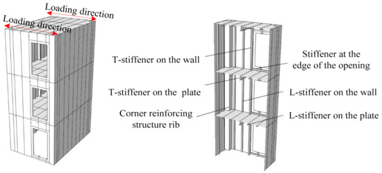 Steel plate shear wall (SPSW) is a new type of lateral force resistant structural member, developed in the 1970s, which is composed of steel plate wall, vertical edge member, and horizontal edge member [1,2,3]. The steel plate shear wall (SPSW) has the advantages of low cost, good seismic performance, and easy design [4,5,6,7]. At present, the basic principle of steel plate shear wall (SPSW) design [8,9,10,11,12] is based on the direct relationship between the capacity of the tension field after buckling of the thin plate and the total lateral load. The box-plate steel structure building [13] is a box structure with stiffened steel plates directly used as load-bearing walls and floors. The box-plate steel structures can be fabricated by modular prefabrication and assembled on site. This structure system has the advantages of a short construction period, integrated design and production, good seismic performance, flexible building space layout, large effective usable area, and good comprehensive economic benefits. Due to the need of building function, it is necessary to open door or window openings on the steel wall plate. Choi et al. [14] carried out the relevant experimental research and theoretical analysis on the steel plate wall with openings, and put forward the calculation formula of the lateral force resistant capacity of the steel plate shear wall with openings without stiffener; Vian et al. [15] conducted experiments and numerical analysis on the lateral force behavior of the shear wall with prefabricated non-stiffened steel plates with openings; Purba et al. [16] conducted numerical analysis on steel plate wall with openings, and gave suggestions on design of openings spacing and size, and gave the reduction of shear bearing capacity of steel plate wall caused by opening. In the previous literature review, research on the steel plate shear wall with openings was basically conducted at the component level, and few studies were conducted at the space stress-bearing unit level of the structure. In order to deeply understand the seismic performance of the box-plate steel structure with openings modular unit (Figure 1), the main works of this paper included: (1) two 1:3 reduced scale three-story single-compartment box-plate steel structures with openings modular units were tested under constant vertical compression and cyclically increasing lateral loading; (2) according to the results of experiment and the failure mode of the box-plate steel structure with openings modular unit, a simplified calculation method was proposed to evaluate the lateral force resistance capacity of the box-plate steel structure with openings modular unit; (3) the proved finite element analysis (FEA) models were used for parameter analysis of different influence parameters to verify the proposed calculation equation.