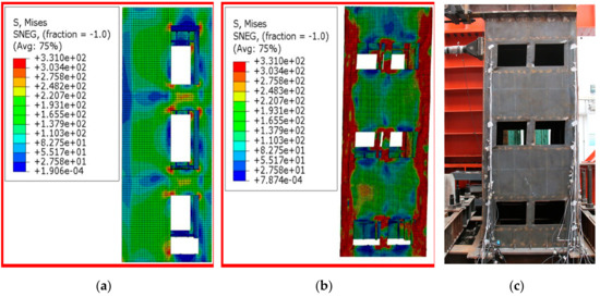 Figure 16a shows the Mises stress cloud image of specimen-2 with the loaded horizontal displacement of 6 mm. It could be seen from the figure that the steel plate with the window opening first yielded, which was consistent with the test process. Figure 16b shows the Mises stress cloud image of specimen-2 at the final failure. According to the stress distribution in Figure 16b, the failure of the specimen-2 was concentrated in the window opening and the four corners of specimen-2, which was in good agreement with the failure mode of specimen-2 at the end of the test, as shown in Figure 16c.