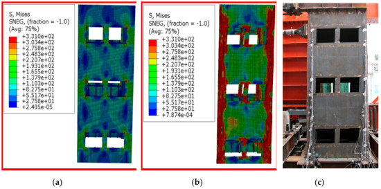 Comparisons of FEA model simulation and test in the failure of the two walls are shown in Figure 15 and Figure 16. As can be seen from Figure 15, the finite element simulation of specimen-1 was basically consistent with the failure process and failure mode obtained by the test. When the horizontal displacement was 8 mm, the Mises stress cloud image of specimen-1 was observed, as shown in Figure 15a, which was in good agreement with the results of the test that the steel plate with door opening first yielded during the test. With the increase of horizontal displacement, the shear force on the gable wallboard of specimen-1 increased gradually. Figure 15b shows the Mises stress cloud image of specimen-1 at its final failure. The comparison between Figure 15b,c showed that the finite element simulation and experimental results were in good agreement.
