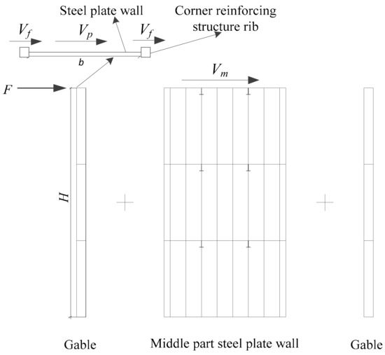 Mao et al. [13] studied the influence parameter and the calculation method of a three-story single box-plate steel structure space stress-bearing modular unit with corner reinforcing structure rib. The key factors affecting the mechanical performance of box-plate steel structure modular units were axial compression ratio (n), the flexibility coefficient of corner reinforcing structure rib (β), and the height-thickness ratio of steel plate (λ). The larger λ, the larger β, and the smaller n could all improve the carrying capacity of the modular unit, where the influence of n was relatively small. The ultimate lateral force resistant capacity of the three-story single box-plate steel structure space stress-bearing modular unit with corner reinforcing structure rib (Vu) could be approximately considered to be composed of three parts: (1) the ultimate lateral force resistant capacity of the corner reinforcing structure rib (Vf); (2) lateral force resistant capacity of gable steel plate in full section shear yield (Vp); (3) the shear force born by the middle part steel plate wall (Vm), as shown in Figure 17. The equation could be written as follows: