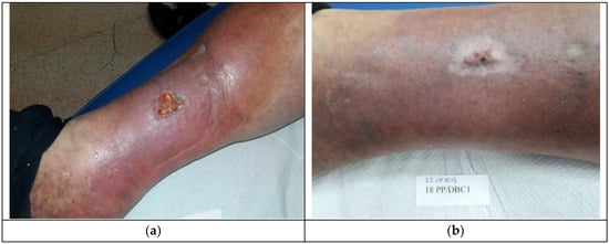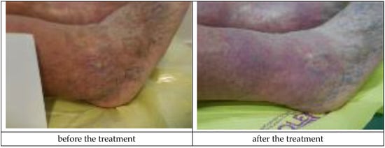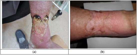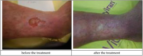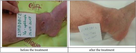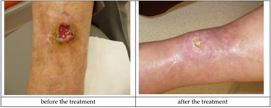 Crus ulceration is a condition where patients suffer from chronic, painful, and hard-to-heal wounds. An ulceration is a wound penetrating through the epidermis and reaching dermal layers. Most commonly, crus ulceration is caused by venous diseases encompassing the veins and arteries (85%) []. Venous ulcerations are chronic wounds requiring intense treatment. The wounds themselves have a significant bearing on the quality of patients’ lives. Inadequate treatment may result in deterioration of the wound condition. The bigger the ulceration and the longer its presence, the more complicated the healing process becomes []. There are many theories that attempt to explain the mechanisms of crus ulcer formation. Within the lower extremities, valve insufficiency causes venous hypertension, which can lead to tissue damage and ulceration []. An increase in venous pressure causes the expansion and elongation of the skin’s capillaries, which disrupts normal microcirculation [,]. The level of leukocytes increases as hypertension leads to the capture and activation of leukocytes, which releases free radicals and other toxic substances that promote cell death and tissue damage []. Hypertension in capillaries causes the penetration of macromolecules into the dermis, which stops growth factors and cytokines necessary for tissue repair []. There are also disturbances in the work of the fibrinolytic system, in which fibrin is usually quickly removed. The resulting disorders in oxygen and nutrient diffusion lead to tissue hypoxia, cell death, and ulceration []. The correct diagnosis of venous ulceration is extremely important. Clinical characteristics of venous ulcers include leg swelling, pain, discharge, and lipodermatosclerosis [,]. Complications associated with venous ulcers include changes in the manner of walking, pain, infections, cellulitis, or dermatitis [].