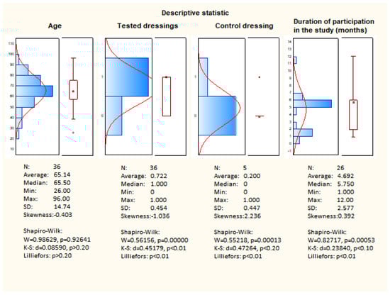 Figure 9 presents descriptive statistics. The clinical study evaluated the efficacy and safety of resorbable dressings (Medisorb R Membrane, Medisorb R Ag, Medisorb R Powder). The study involved 36 patients aged 26 to 96 years. The average age of the patient was 65.5 years with a standard deviation of 15 years.