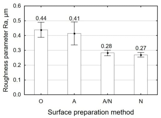 Figure 3 shows the effect of surface preparation technique on the roughness parameter Ra. The results demonstrate that the arithmetic average of the ordinates obtained for the surfaces after alkaline degreasing (O) and that obtained for the anodized surface (A) are similar and amount to Ra ≈ 0.42 µm. After shot peening (N), the surface roughness parameter Ra decreased to approximately 0.27 µm, that is, by 35% compared with its pre-treatment value, irrespective of the employed surface preparation method.
