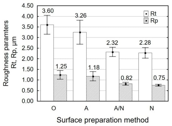 Figure 4. Surface preparation method versus profile height parameters (Rt, Rp).