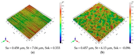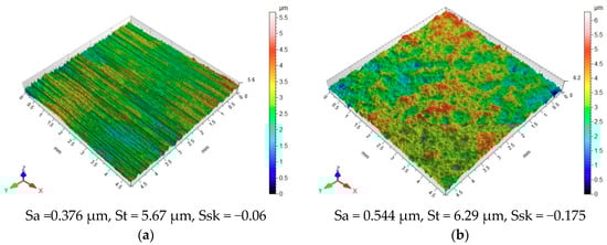 The results plotted in Figure 6 and Figure 7 indicate high discrepancies between the parameters Ssk and Rsk. The Ssk parameter describes the surface with an area of 4.8 mm × 4.8 mm, while the Rsk parameter is a measurement average calculated on a measuring length of 4.8 mm. The 4.8 mm × 4.8 mm surface has numerous peaks and valleys that counterbalance on the analyzed area.